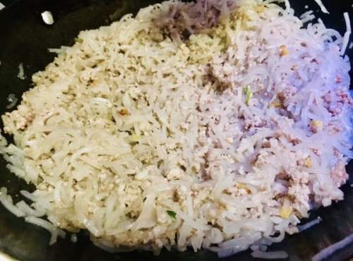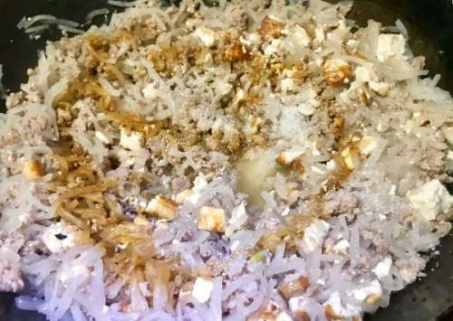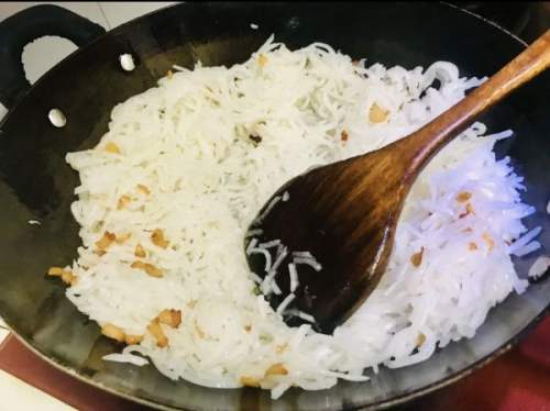 6锅内先肥肉先炒一下,炒香,熬出油,放入萝卜丝翻炒