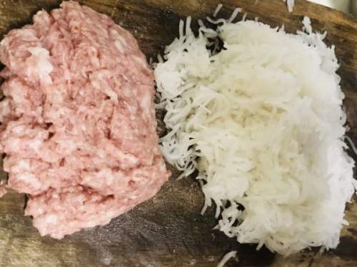 4把夹心肉剁成未,留点肥肉颗粒,用于炒萝卜丝,炒的时候会香点。萝卜丝会有很多水分出来,挤干水分,剁几刀
