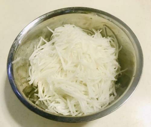 1白萝卜把皮刨了,擦丝,放少量盐腌制