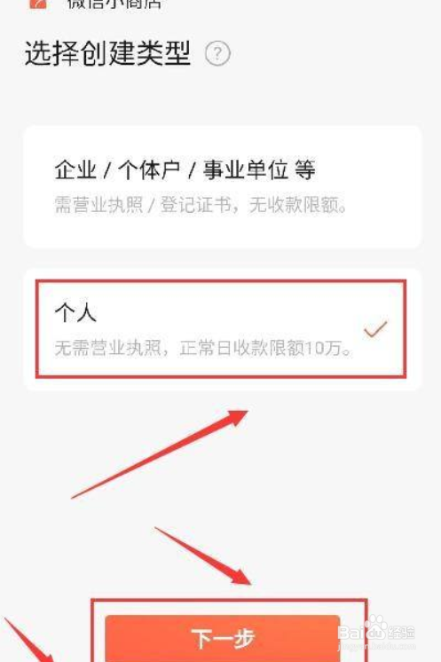 点击“个人”,点击“同意”,点击“下一步”,等待开店成功提示即可