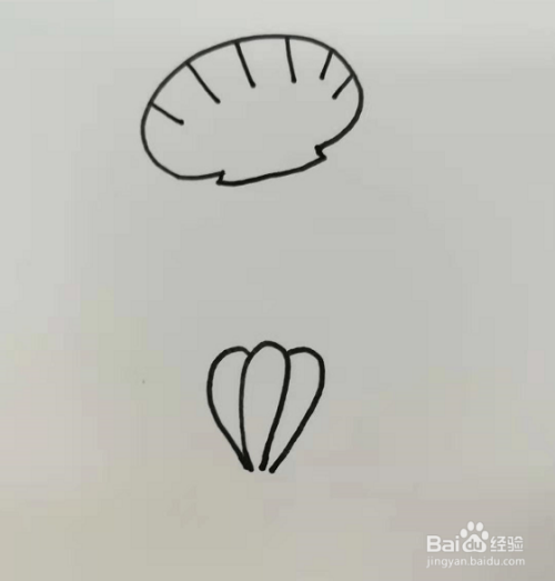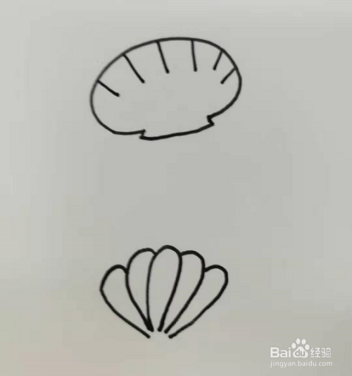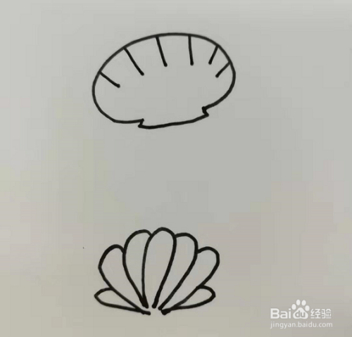 通过上面的步骤,我们就把一个贝壳画好了,这里我们接着开始画第二个贝壳,在纸上画上一个倒置的水滴的形状,具体如下图所示。