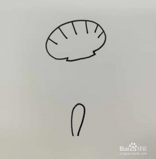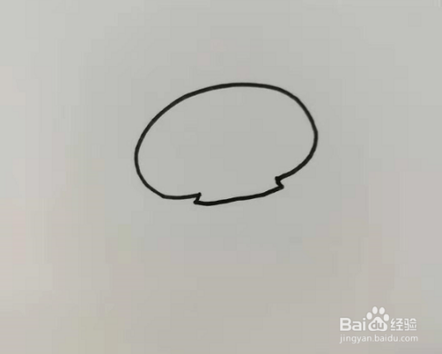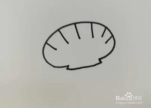 第二步,在刚刚画好的椭圆的空白的部分,我们画上两条往下的小小的折线,把椭圆连接起来,这样贝壳的大体形状就画好了,具体如下图所示。