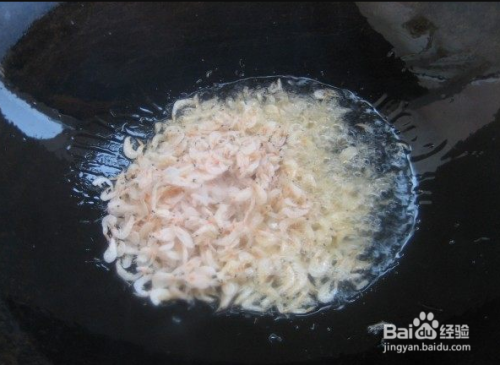锅中放入适量的花生油,油温7成热后放入虾皮翻炒至变色。(炒过的虾皮就没有醒味了)