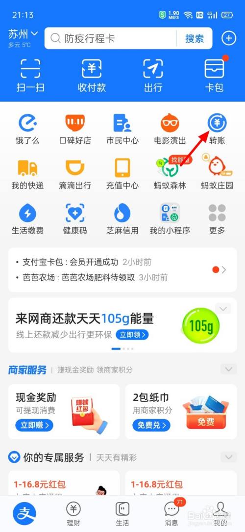 在手机上打开支付宝,兑换免费提现额度,在转账中输入卡号确定就可以,以下为详细步骤说明: