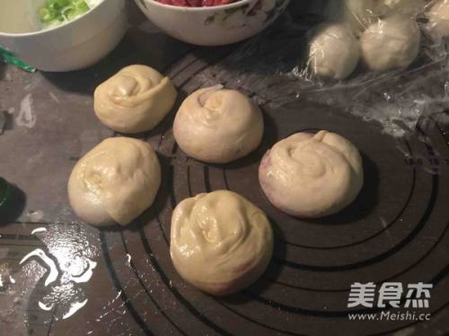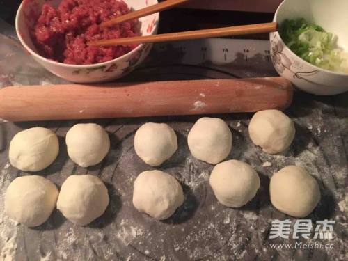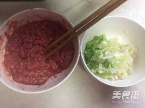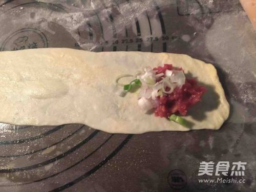 8将一团牛肉馅和大葱放在面皮的一头