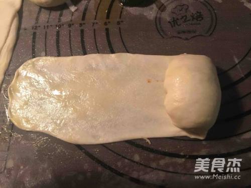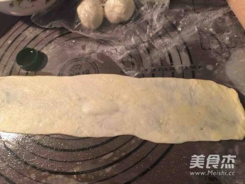 7松弛10分钟以后,取一小份面团,慢慢的捏成小长条,捏住面团两头,将它扯得更长一些,用擀面杖擀成薄薄的长条形。要尽量长尽量薄一些,薄到有点透明的感觉。双面都涂抹一层植物油