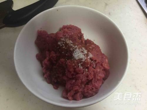 2把花椒粉、盐、白胡椒粉、砂糖、蚝油、姜末、生抽加入牛肉馅中,搅拌均匀,再加入料酒和一点水,快速用筷子搅打到发粘湿润的状态就好了