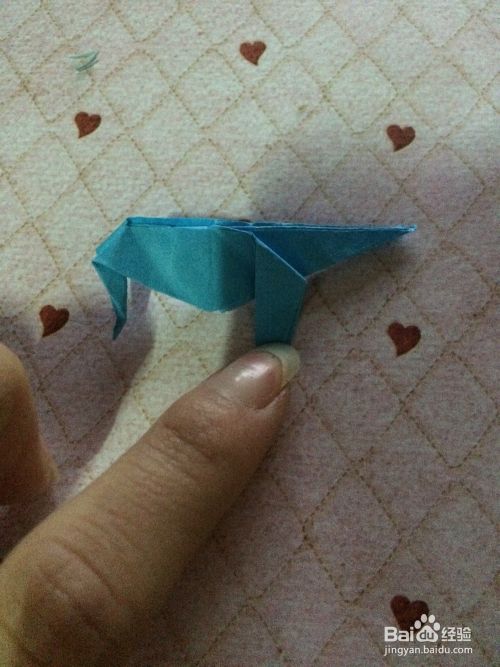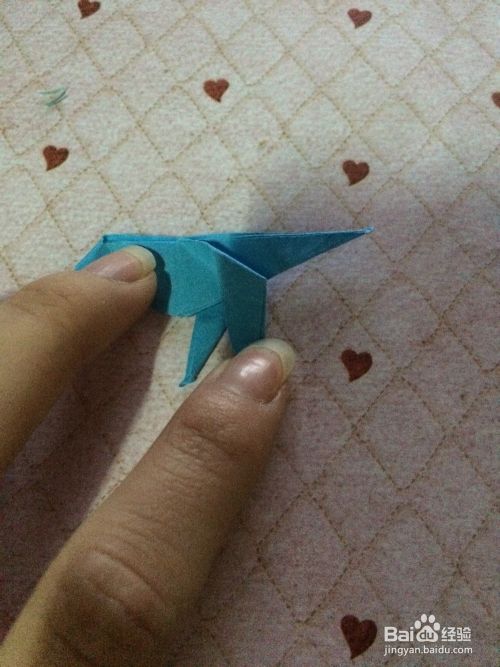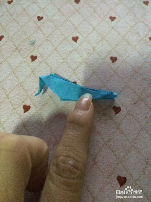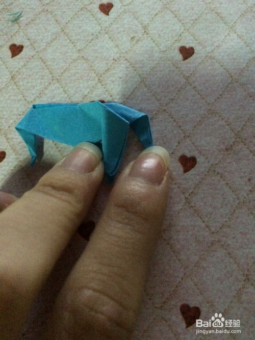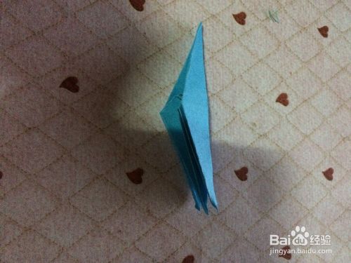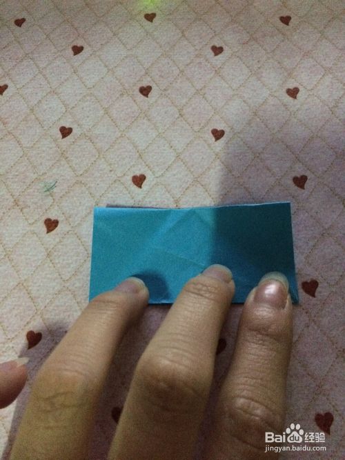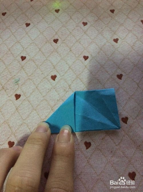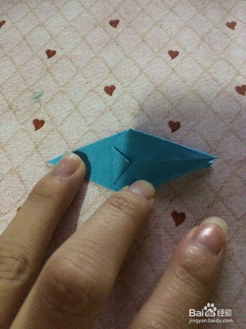 如图所示,把左上角往下折好,翻到背面也是。然后从中间打开,里面左右沿线对折成双菱形。