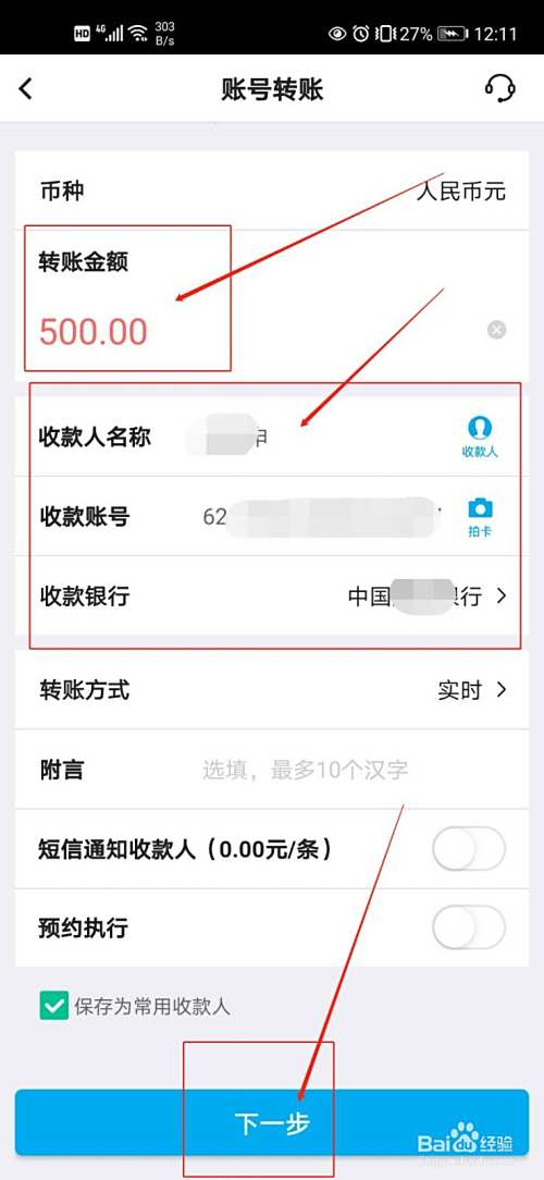 第四,输入转账金额和收款人信息,点击“下一步”