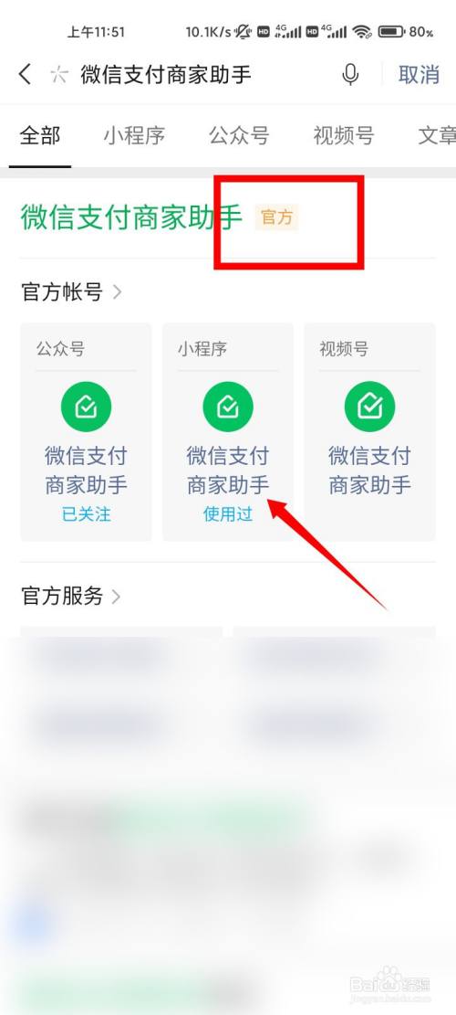 输入关键词微信支付商家助手,点击官方标志的小程序进入。
