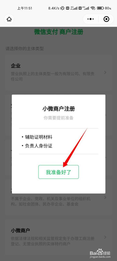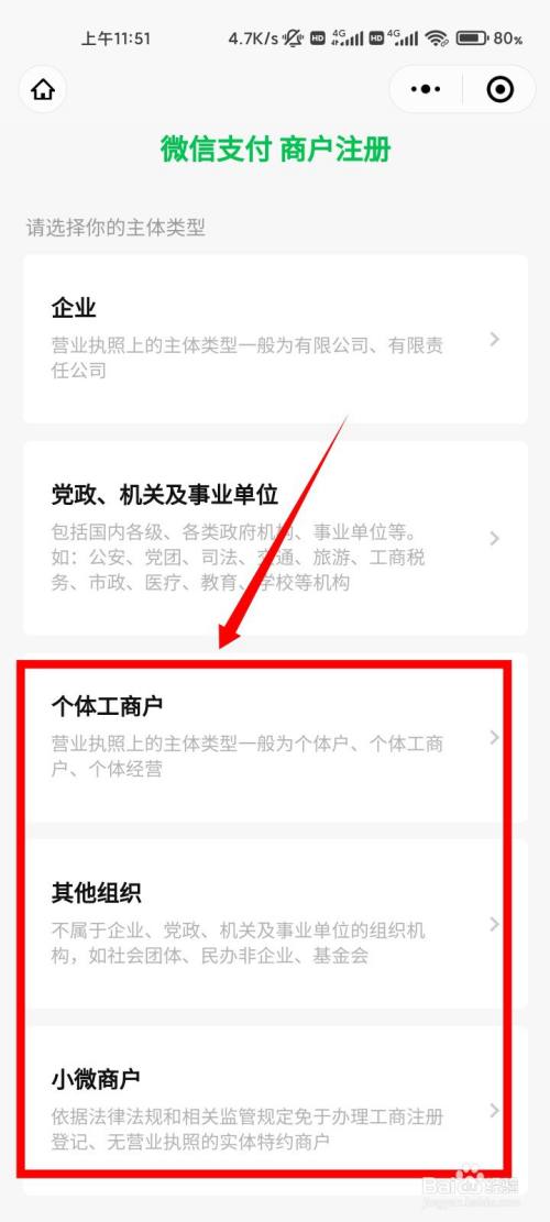 点击申请成为个体工商户、其他组织或者小微商户的选项,根据自己的实际情况选择。