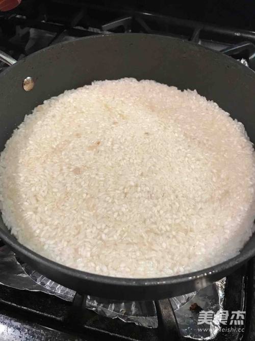 6炒干后转小火,平铺米面,将备加高汤!加至刚好没过米面!加盖!喜欢米软点的可以多放少许水!