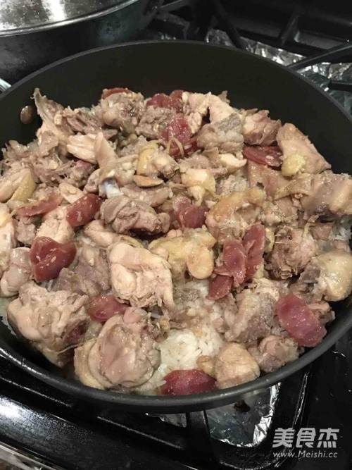 1025~30分钟后,就可以把炒好的鸡放至饭的表面,继续小火焖10分钟!
