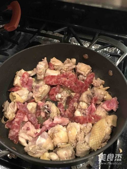 2热油锅,放鲜蒜蓉爆香,再放腌好的鸡炒至5成熟,再放入腊肠片炒1~2分钟,盛起备用!