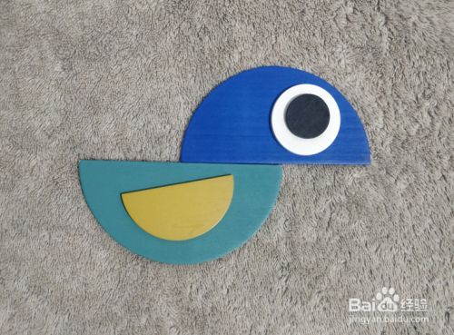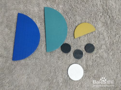 准备好蒙氏几何积木。此处用到的是2个大半圆、1个小半圆、1个白色圆形、3个黑色小圆形,如图所示。