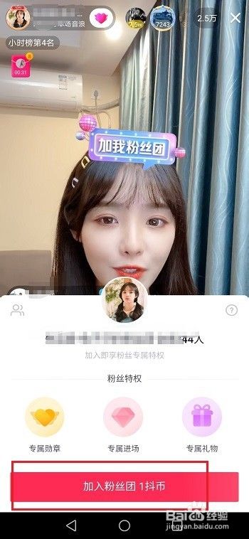 第五步加入粉丝团需要1抖币,可以充值后再加入,根据需要选择,如下图所示: