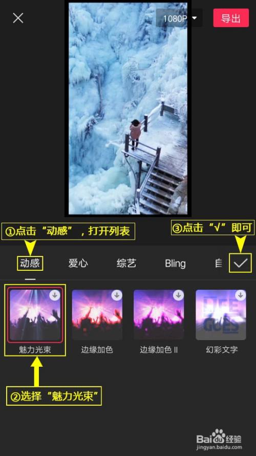 选择特效。点击“动感”选项卡,打开列表,选择“魅力光束”特效,点击列表右上角的“√”即可。