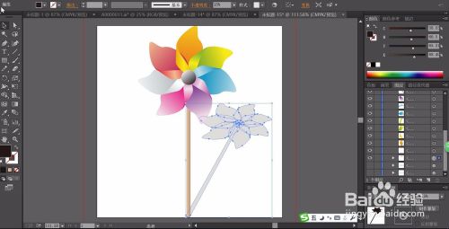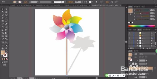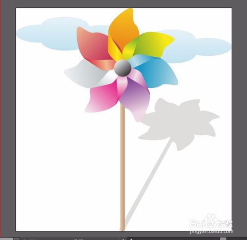 使用矩形工具画出这个风车的手柄,我们用棕色的渐变填充,再复制一个所有的叶片的路径填充半透明的灰色并进行扭曲与变形让其成为一个阴影在右侧。完成风车图片设计。