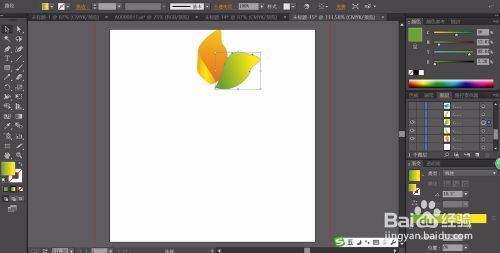 用同样的办法设置一个黄绿色的渐变,我们复制一下橙色的叶片并旋转60度左右,我们用黄绿色的渐变填充这个叶片。