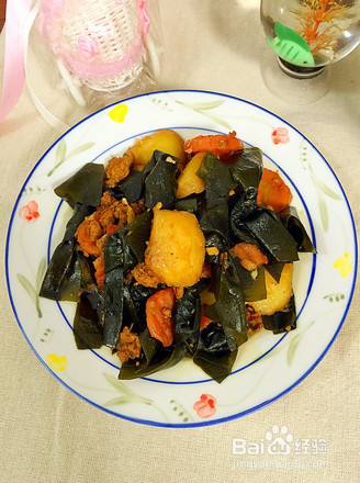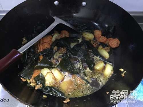 7将土豆块和胡萝卜入锅烧,加入盐,白砂糖调味,5分钟后即可出锅