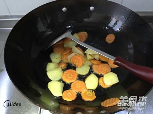 3油烧热后,将土豆和胡萝卜烧至表面金黄捞出备用