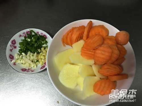 2土豆和胡萝卜切块,姜葱蒜切碎