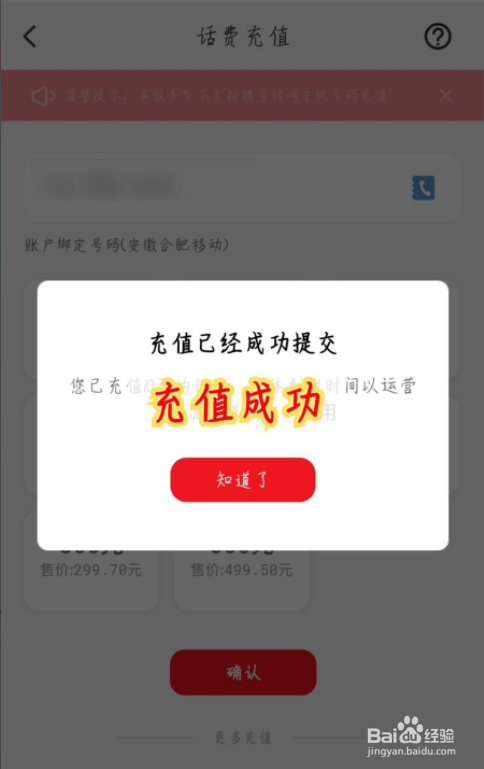 话费充值提交后,会弹窗提示。如图所示