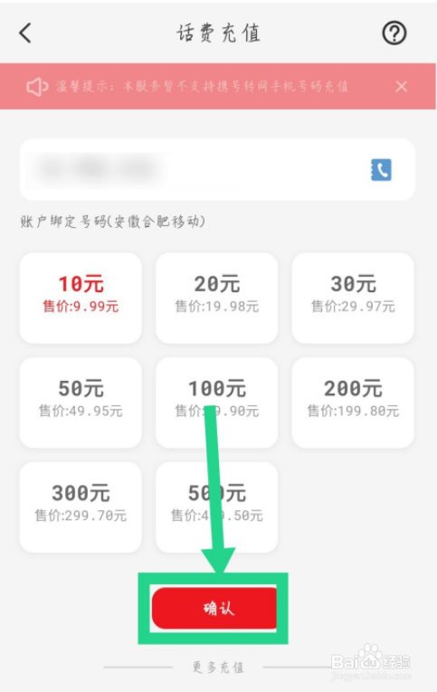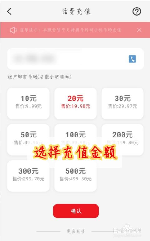 然后选择要充值的话费金额。如图所示