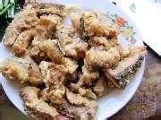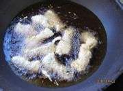 将鱼段裹面糊,入烧至180左右的锅中,中火炸制。