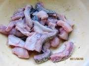 将鱼去鳞片切成中指般粗的鱼段,用料酒、盐、胡椒粉腌制半小时。