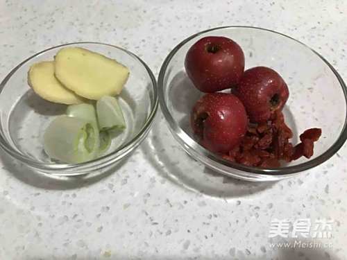 3葱切三小段,姜切片,山楂洗净去核,枸杞子洗净控干水分。