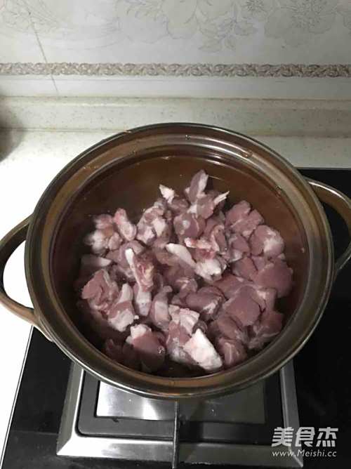 5将切好的羊肉一同倒入冷水中。