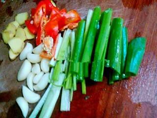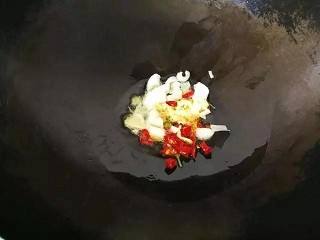 锅内倒入食用油,加热,放入生姜、大葱和红辣椒,炒香。
