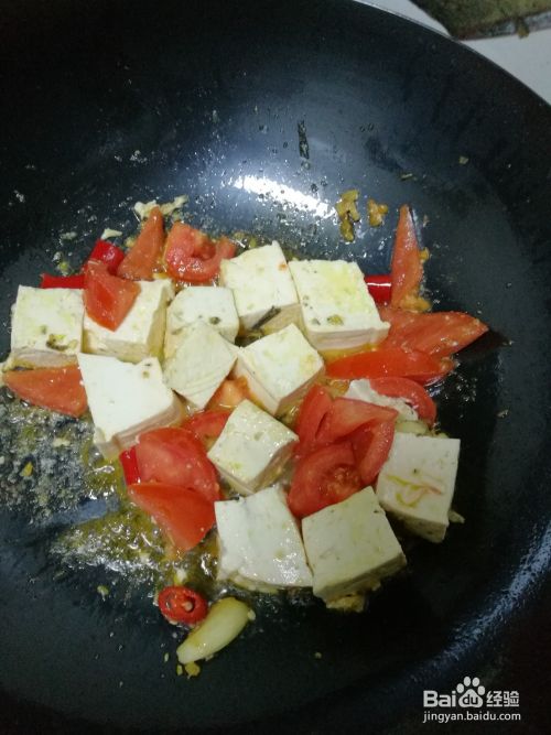 再将西红柿放进去把汁弄出来,跟豆腐一起翻炒。