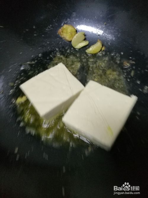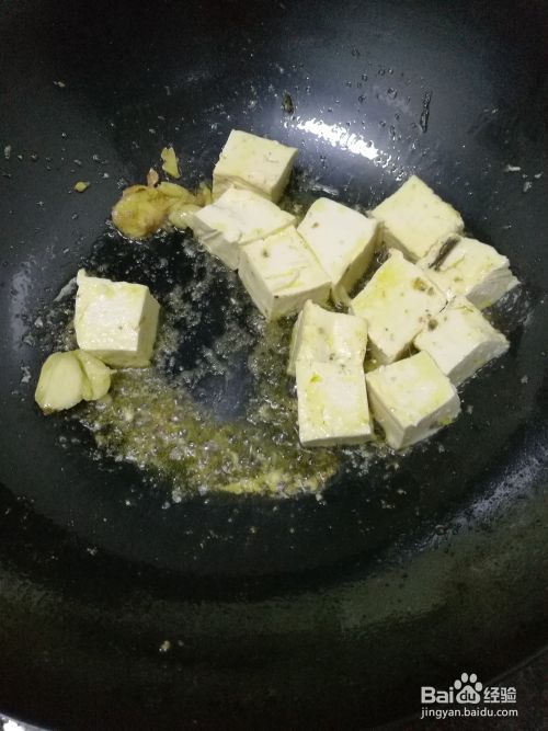 然后再倒入适量的油,将豆腐放进去煎着,并用锅铲切成小块状。