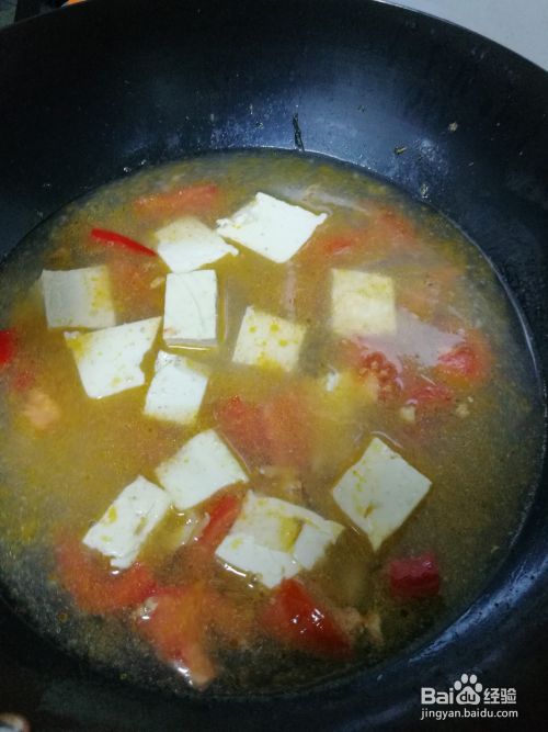 加入适量的水份,盖住西红柿跟豆腐,加入适量的盐,盖住锅盖煮开。