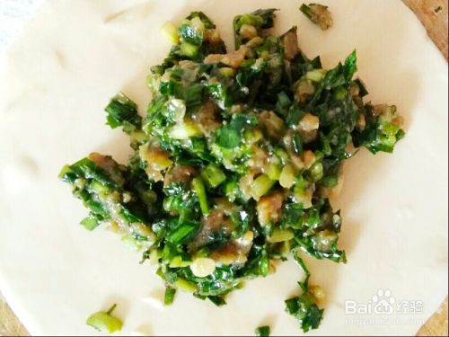把调好的肉馅,用小勺子挖出来适量的肉馅,放在擀面杖擀好的片上。要掌握放在片上的肉馅的量。肉馅放的太多容易坏,肉馅放的太少又不好吃。