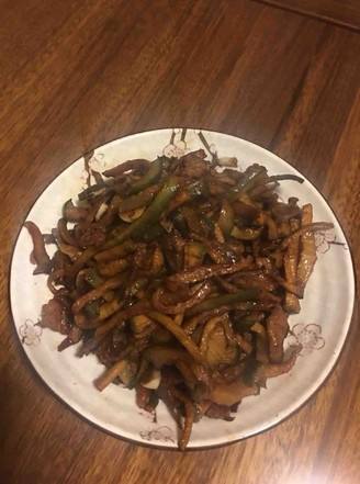 5变色后放萝卜干,姜片翻炒。然后放花椒粉,五香粉,鸡粉,翻炒一会儿后再放酱油,一点点陈醋,糖。如果想上色可以放一点老抽不想上色就不用放了。翻炒一会儿加一点点水再炒一下就好了。
