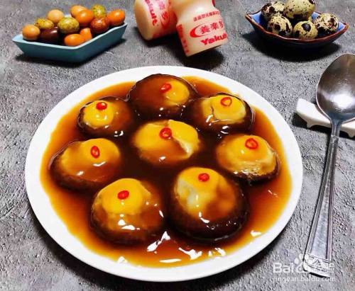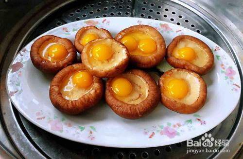 蒸好的香菇鹌鹑蛋依次摆入盘中。