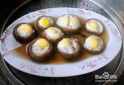 香菇鹌鹑蛋摆入盘中再放人烧开水的蒸锅大火蒸五分钟。