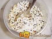 2把芝麻、花生碎、椰丝等炒香,加上砂糖拌匀,成为馅料。