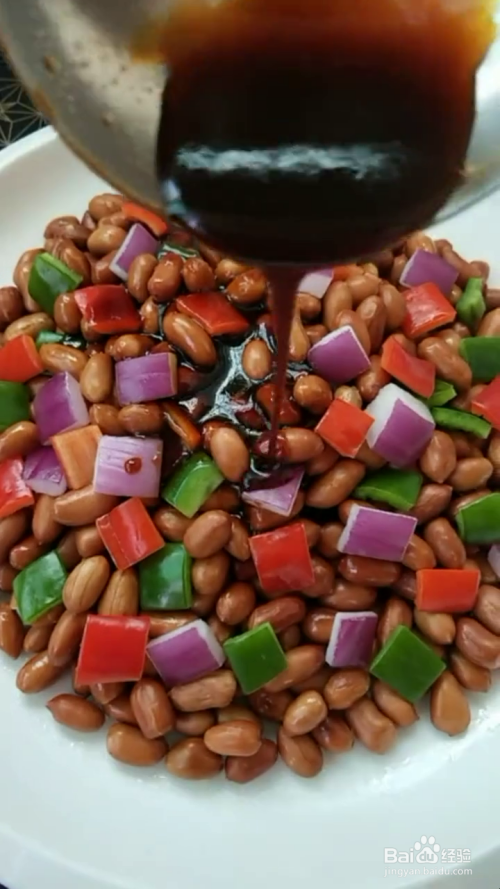 然后在控去油的花生米中加入洋葱丁,青红辣椒丁,搅拌均匀备用