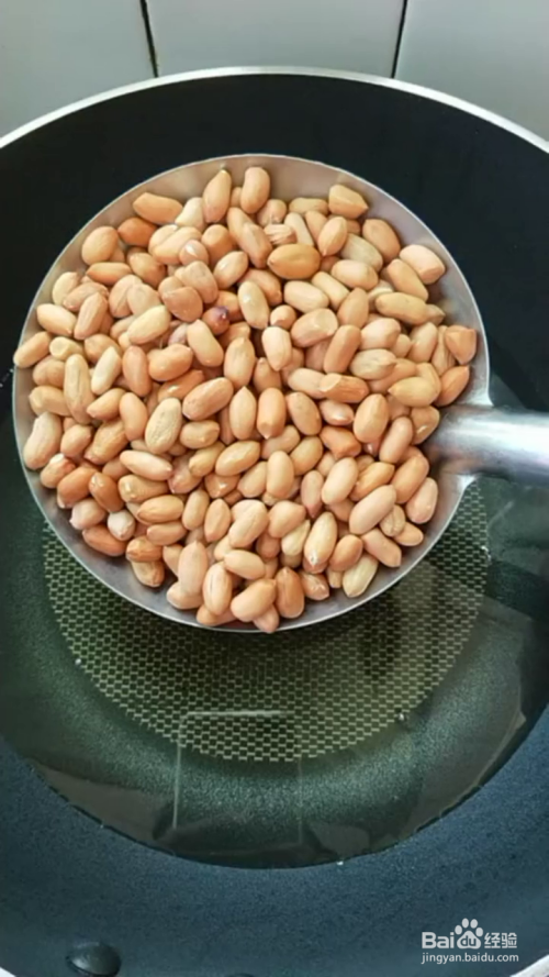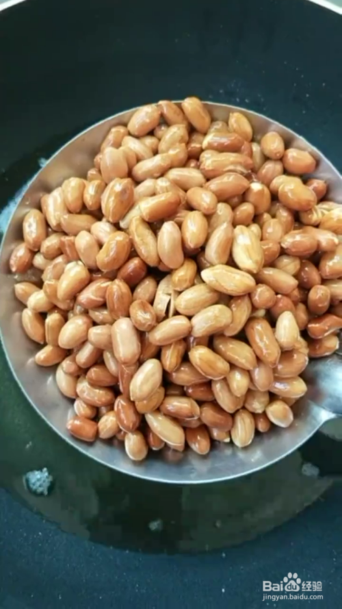 我们在锅中放油,同时下入花生米,小火加入至将花生米炸熟(刚出现轻微的炸裂声,再炸三十秒左右,就能关火)捞出