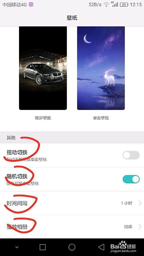 壁纸里可以选择“摇动切换”或者“自动切换”,自动切换下可以设置时间间隔和播放相册,选择需要播放壁纸的相册