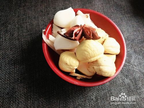 然后再准备好配料,生姜和大蒜籽都去皮,切成片备用,取出一粒八角和冰糖备用。