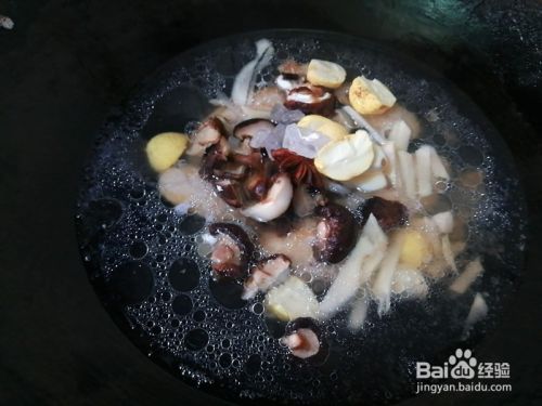 再把泡发的香菇一个切成两块放进锅里,再把所有配料也放进去,放一碗水,盖盖子中火焖至收汁,撒上葱花即可。
