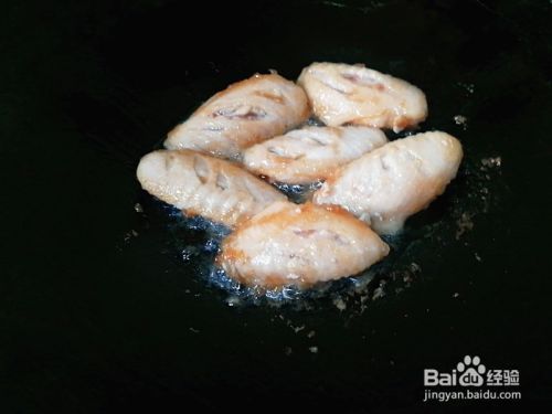 锅烧七成热,放一小碟花生油,把腌好的鸡中翅放下去小火煎至两面金黄色。