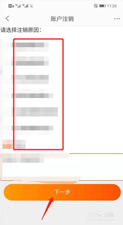 3,选择一个注销的原因,点击‘下一步’,即可根据提示完成相应内容。最后一个是‘其他’如果勾选了,一定要在文本框里协商注销的理由,否则不能通过。希望能帮到更多的人!