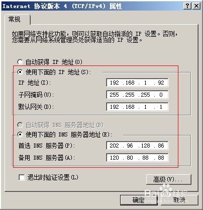 比如:路由器的IP是192.168.1.1的话,那么手动设置电脑的IP为:192.168.1.X,其中X为2-254之间的任何一个数字。子网掩码为255.255.255.0,网关为路由器IP地址:192.168.1.1,DNS看地区,最好是问运营商,广东电信的话是202.96.128.86