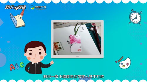 4给书签系上丝带:用美工刀在书签的上端刻出一条小缝隙,将丝带穿入其中打结。